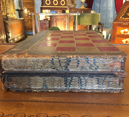 COFFRET - JEU Rare coffret en forme de livre à jeu de jacquet, backgammon et tric-trac. Il est en cuir frappé sur âme de bois. Jetons en ivoire, manque un blanc. Bon état général. Angleterre Vers 1815 Dimensions Longueur: 45 cm Hauteur: 8 cm Profondeur: 25 cm