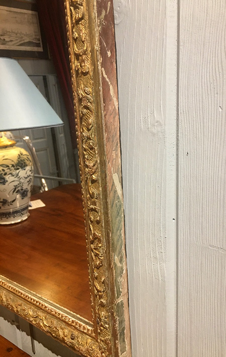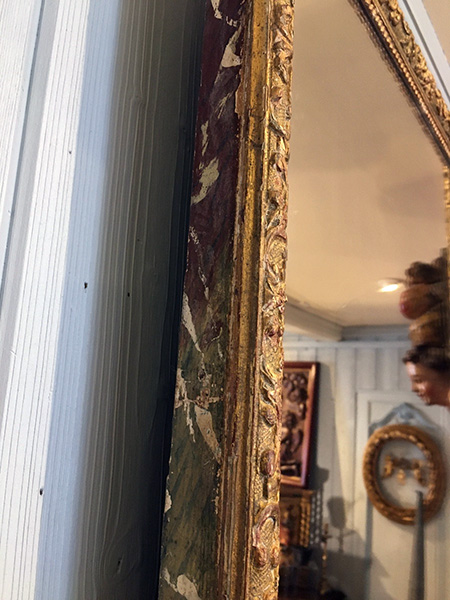 Le support sur lequel viennent le miroir (postérieur) et les baguettes est en bois à décor de faux marbre.
