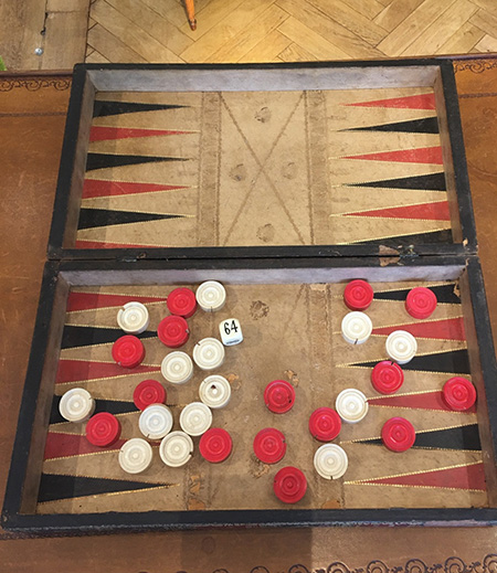 COFFRET - JEU Rare coffret en forme de livre à jeu de jacquet, backgammon et tric-trac. Il est en cuir frappé sur âme de bois. Jetons en ivoire, manque un blanc. Bon état général. Angleterre Vers 1815 Dimensions Longueur: 45 cm Hauteur: 8 cm Profondeur: 25 cm